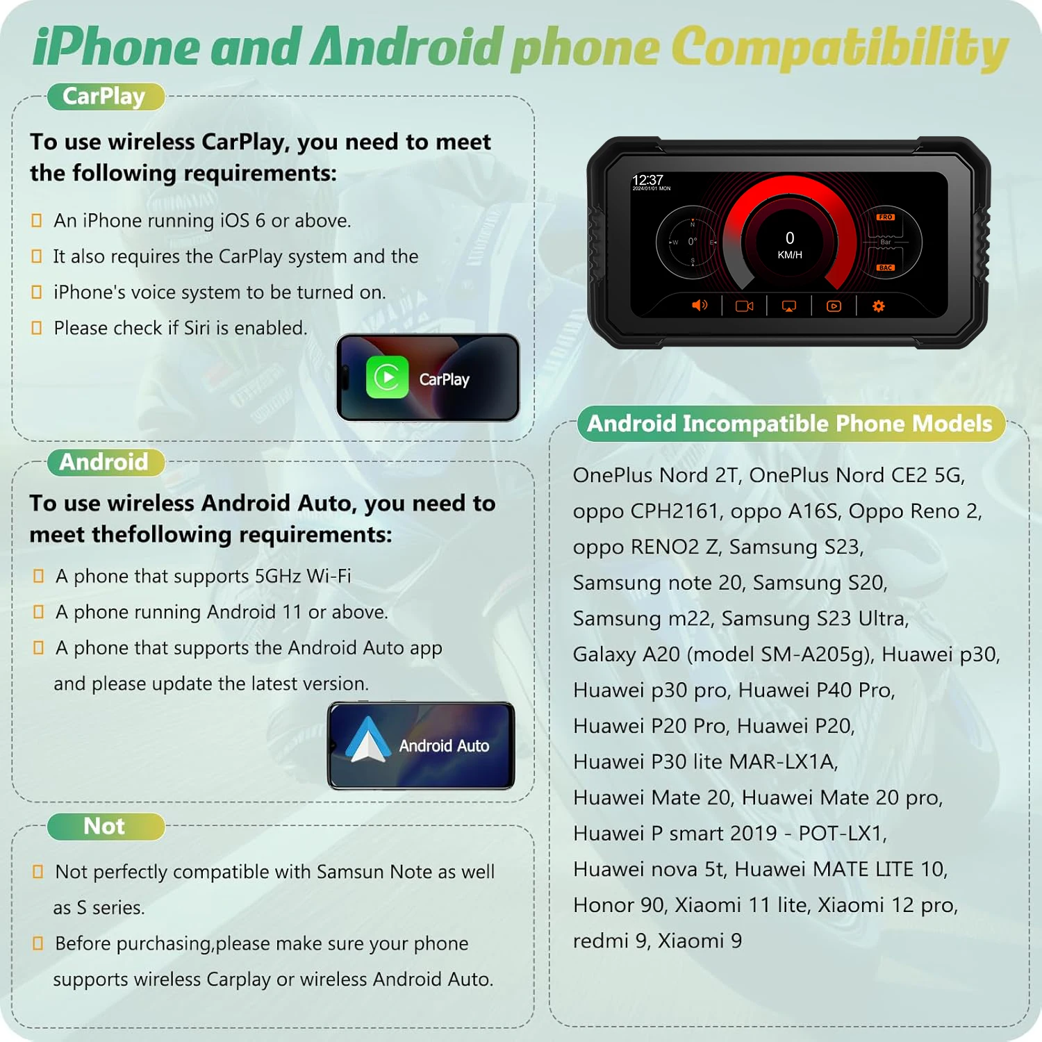 - ✔️ CarPlay & Android Auto sans fil – Intégration complète du smartphone sans câbles pour Motorcycle.